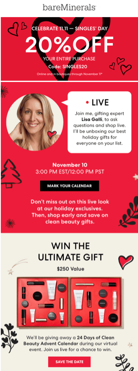 For example, Bare Minerals packages its 20% off discount offer with a live virtual event, a prize giveaway and a specially priced bundle.