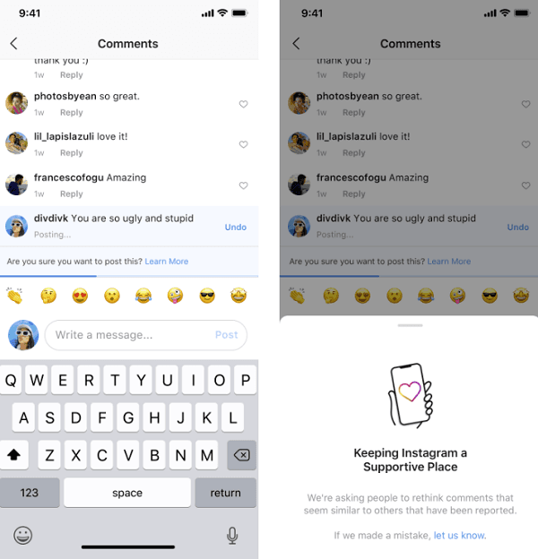 A spokesperson for Instagram said, "This intervention gives people a chance to reflect and undo their comment, and prevents the recipient from receiving the harmful comment notification. From early tests of this feature, we have found that it encourages some people to undo their comment and share something less hurtful once they have had a chance to reflect."