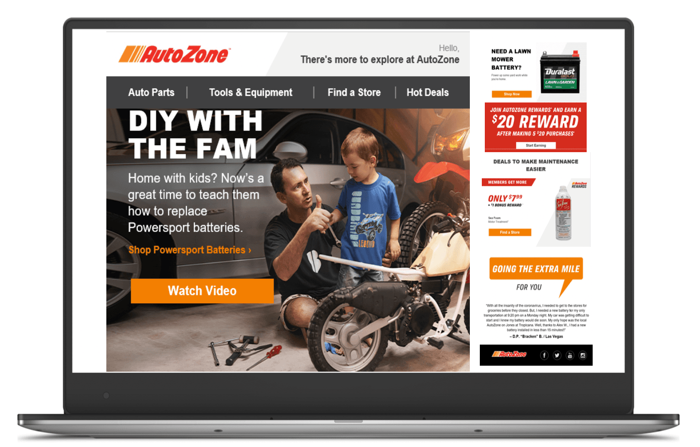 Autozone used a “helping over selling” approach where product-centric savings, rewards and offers are balanced with much more purpose-oriented messaging. This example shows how their DIY content, encouraging education and engagement, is balanced with a promo to join their rewards program and other deals.
