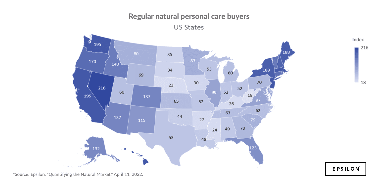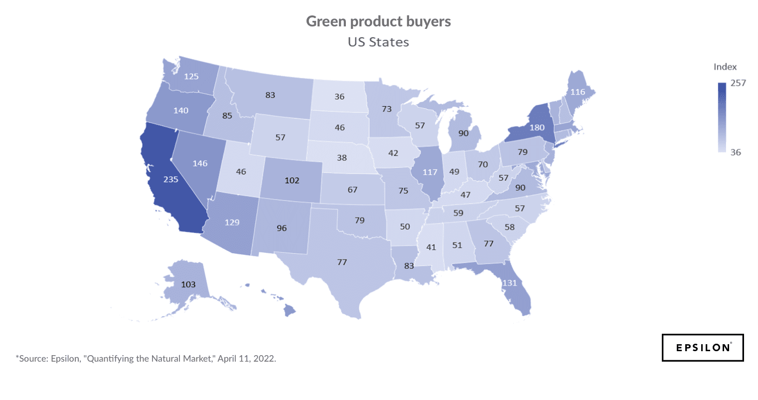 When looking at buyers’ potential to be green shoppers across the US, we see very few states that actually over-index for this group. The usual suspects show up, like California, Oregon, Washington and New York, but we also see states like Arizona, Nevada and Florida as areas with more than average green-product buyers.