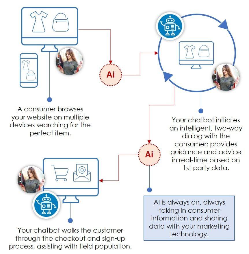 Interestingly, Conversational AI as a channel doesn’t have just one designated place in the customer journey. It’s omnipresent. Conversational AI enhances the customer journey and facilitates personalized experiences, while “always on” in the background—learning and understanding the actions of a customer, ready to engage by feeding data through your marketing technology. Consequently, Conversational AI crafts the ultimate connected experience, and successfully drives outcomes like loyalty reward programs, unique shopping experiences, and cross sell or up sell opportunities. See, for example, below: vvvvvvvvv