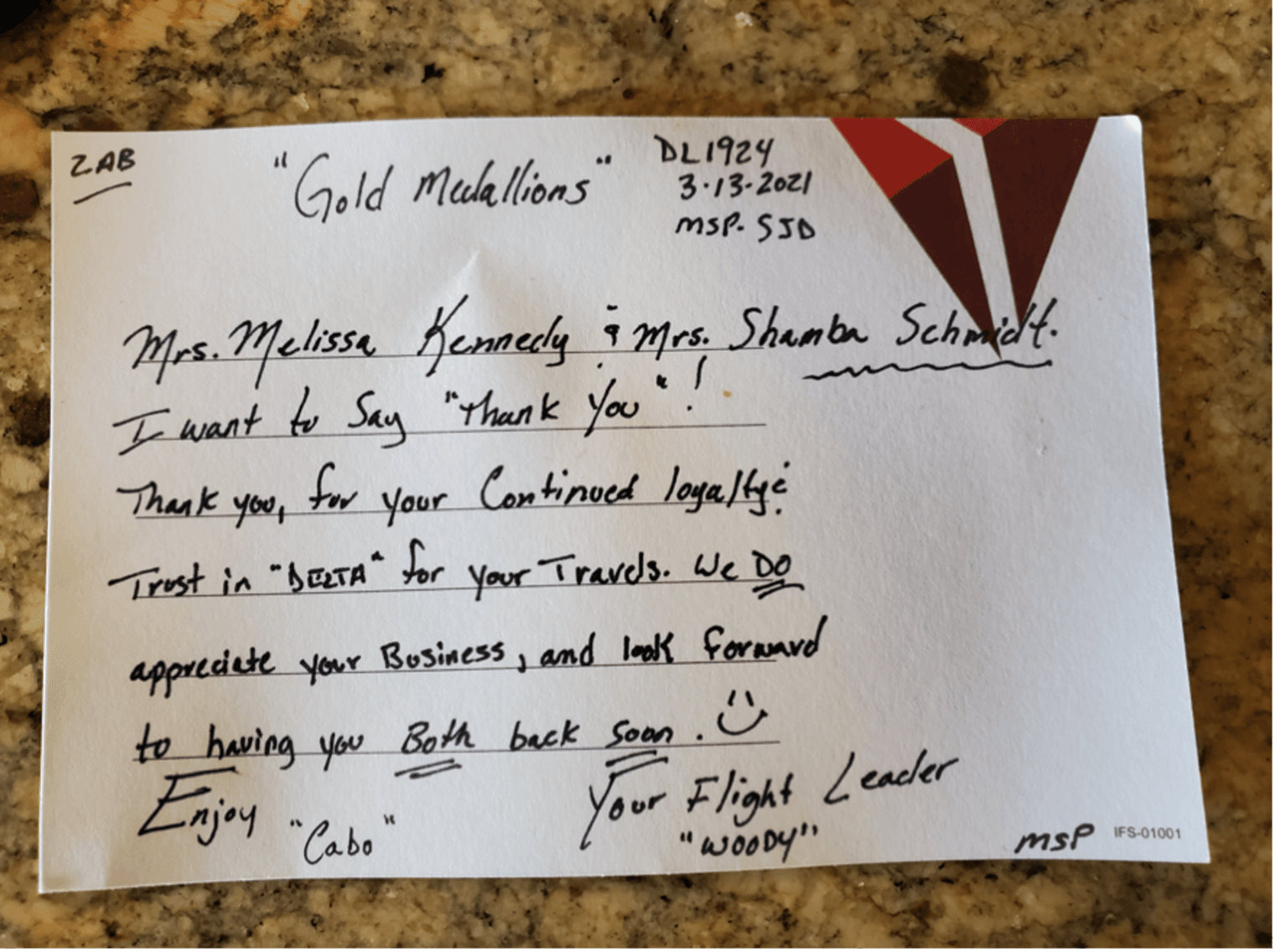 Example of free tactic for loyalty: This was a hand-written note I received from a Delta flight attendant last week when I flew to Cabo.
