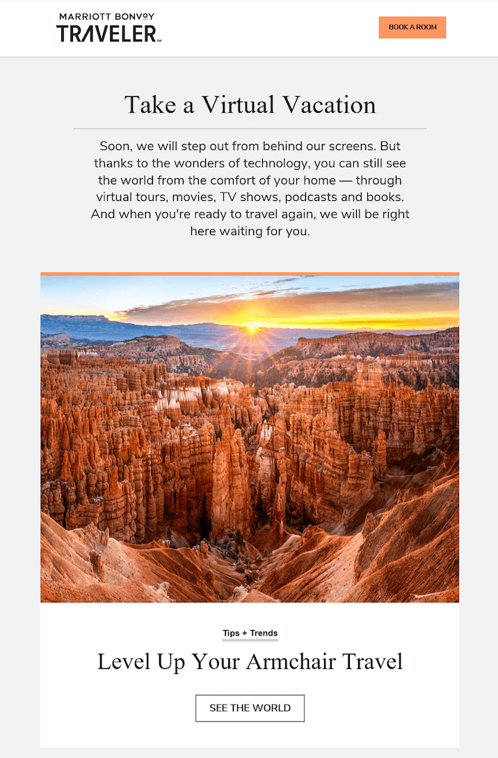 When the crisis caused travel to come to a screeching halt, Marriott found a way to deliver a clever and engaging email that invited customers to enjoy a virtual vacation without leaving home. It offered much-needed escapes to beautiful and exotic destinations that were just a click away. Marriott designed the interactive email with attention-getting, interactive email hover buttons that changed color from white to black every time you hovered or rolled over them. The interactive email encouraged customers to get inspired and dream about their next vacation by experiencing virtual tours, movies, TV, podcasts, books and Marriott Bonvoy’s social channels. It also encouraged them to enjoy these destinations live and in person when the world opens up.