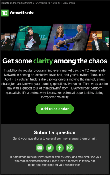 This interactive email aligned with investor fears during this time of crisis and helped customers get clarity among the chaos of the volatile stock market. It invited them to an exclusive Townhall virtual event and included an add-to-calendar feature that populated the event on the customer’s calendar to remind them to attend.