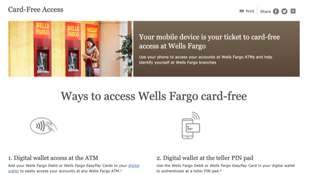 Chase and Bank of America use mobile wallets such as Apple Pay and Google Play, whereas Wells Fargo and Capital One have their own apps. Wells Fargo was the first major bank to roll out “cardless” technology across their entire network of 13,000 ATMs. In 2017, they saw digital transactions and ATMs as their top engagement drivers—and now all their ATMs offer cardless transactions.