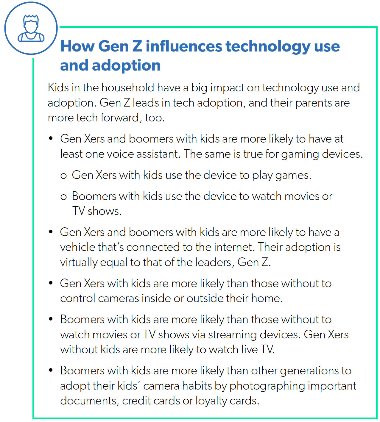 Generation Z has the power to influence other generations. Put another way, younger generations’ thinking and adoption of technology filters through to their parents, and maybe even to their grandparents.