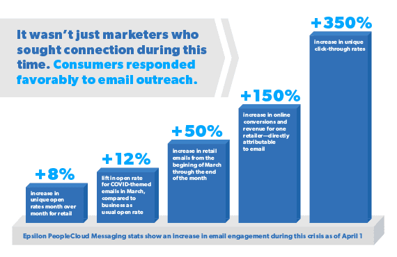 In response to the COVID-19 crisis, companies and consumers both felt a lot of uncertainty, panic and anxiety. Marketers had to swiftly provide facts, comfort, support and reassurance—all while working to evolve their businesses. Epsilon PeopleCloud Messaging statistics found that email marketing proved to be the most critical communication channel between brands and cunsomers because it’s personal, reliable, relevant and targeted.