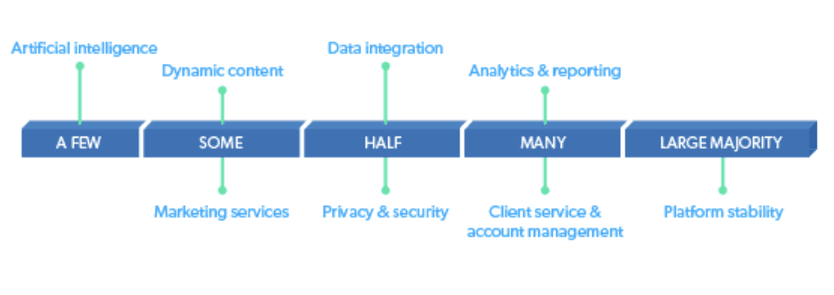 When provided with a list of qualities that are most important in an email marketing partner during their COVID-19 experience, the common responses from our client responders were platform stability; analytics and reporting; and client service/account management. Platform stability was rated as the most important quality.