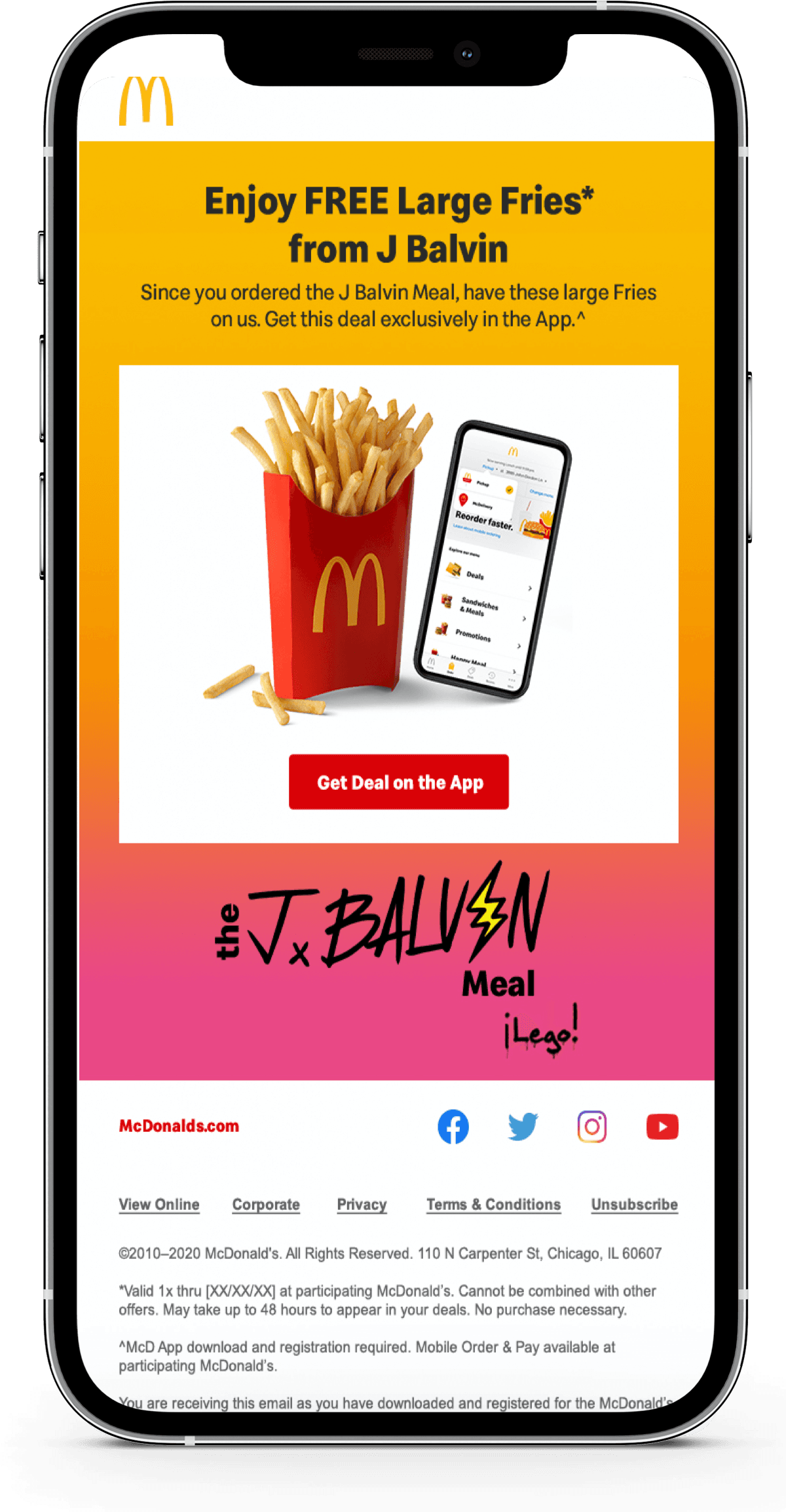 Leveraging Epsilon’s integrated marketing platform, McDonalds sent emails and pushed notifications through channels like SnapChat and Instagram for Famous Orders, using personalized experiences for each phase of the campaign. They were careful to choose the channel based on fan-based demographics and other insights.