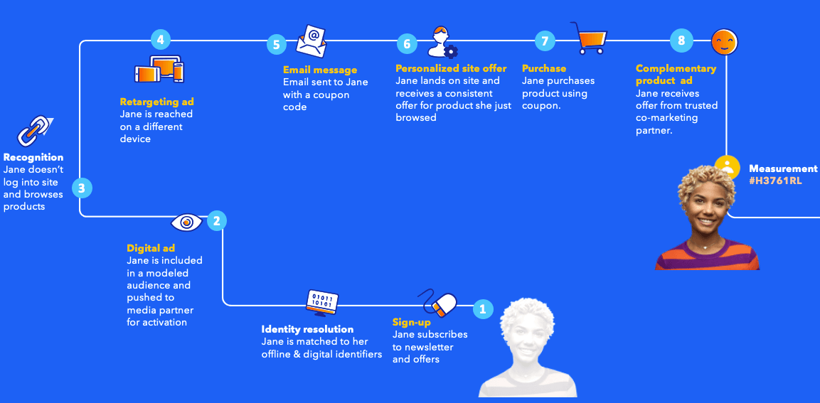 Using identity resolution within Customer, we align Jane to CORE ID, include her in a modeled audience alongside other in-market customers within Customer, then that audience is activated through Epsilon Digital where she gets an ad. This sets off a series of events that takes Jane from just a newsletter subscriber to a purchaser, and eventually a repeat customer.